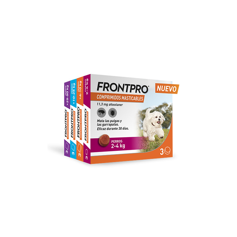 FRONTPRO® es un comprimido masticable con Afoxolaner, que protege a su perro de pulgas, sus huevos, y garrapatas durante 30 días. De efecto rápido y eficaz, el tratamiento se recomienda para todas las razas de perros, a partir de las 8 semanas y un peso mínimo de 2kg.